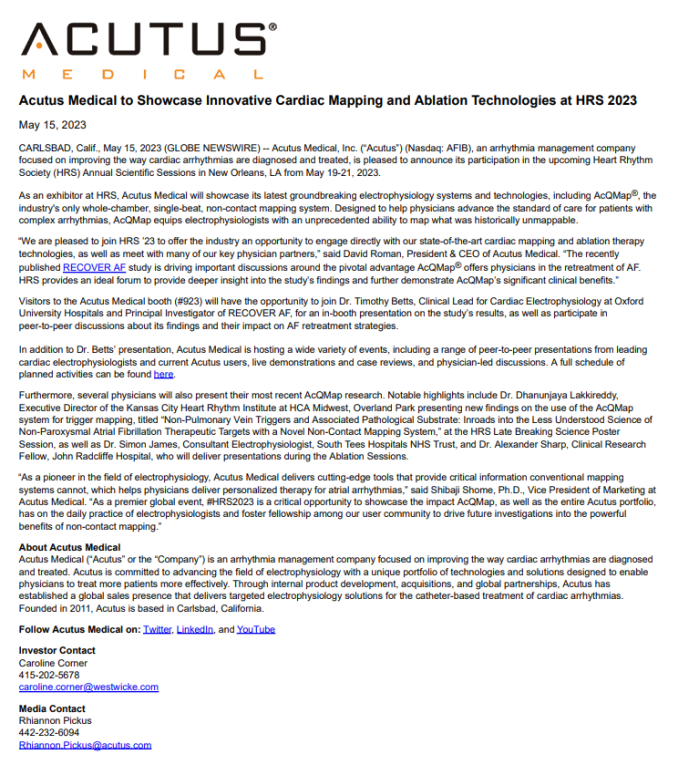 Acutus Medical to Showcase Innovative Cardiac Mapping and Ablation Technologies at HRS 2023 Type: Corporate Communications, Press Releases acutus-medical-to-showcase-innovative-cardiac-mapping-and-ablation-technologies-at-hrs-2023Download Related
