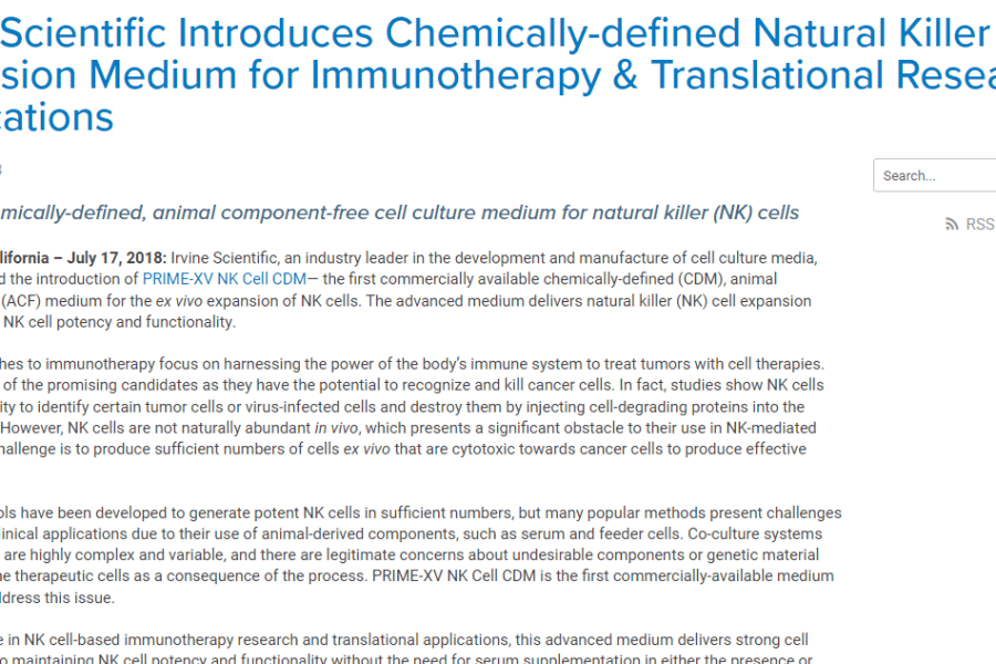 Irvine Scientific Introduces Chemically-defined Natural Killer Cell Expansion Medium for Immunotherapy & Translational Research Applications Type: Corporate Communications, Press Releases