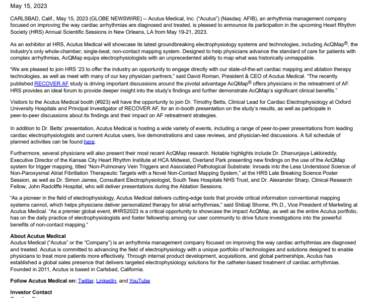 Acutus Medical Announces Preliminary Unaudited First Quarter 2023 Results Type: Corporate Communications, Press Releases
